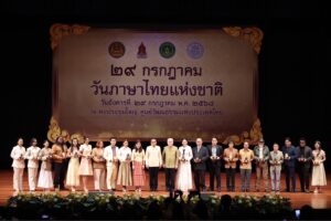 กระทรวงวัฒนธรรมจัดงาน “วันภาษาไทยแห่งชาติ พ.ศ. 2568” ภายใต้แนวคิด “ร่วมสืบสานภาษาไทย ภาษาของชาติ ปลูกปัญญาด้านภาษาอย่างยั่งยืน” โดยมี “นายประสพ เรียงเงิน” ปลัดกระทรวงวัฒนธรรม เป็นประธาน พร้อม “นายพนมบุตร จันทรโชติ” อธิบดีกรมศิลปากร, “นางยุถิกา อิศรางกูร ณ อยุธยา” อธิบดีกรมส่งเสริมวัฒนธรรม ร่วมด้วยผู้บริหารกระทรวงวัฒนธรรม ศิลปิน ดารา นักร้อง และผู้ได้รับรางวัลเนื่องในวันภาษาไทยแห่งชาติ พุทธศักราช 2568 เข้าร่วม ณ หอประชุมใหญ่ ศูนย์วัฒนธรรมแห่งประเทศไทย