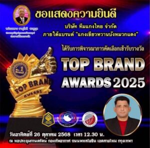 โดยธุรกิจแฟรนไชส์อาหารชื่อดัง จาก บริษัท ทีมแกงไทย จำกัด ภายใต้ แบรนด์ แกงเขียวหวานบังหมวกแดง ถูกคัดเลือก และพิจารณาผู้ทรงคุณวุฒิ ให้เข้ารับรางวัลธุรกิจผลิตภัณฑ์ (แบรนด์) ดีเด่น ปีที่ 10 ประจำปี 2568 หรือ Top Brand Awards 2025