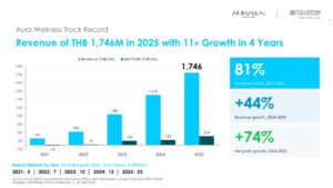 ในปีที่ผ่านมา Aura Wellness ทำรายได้รวมสูงถึง 1,746 ล้านบาท เติบโตขึ้น 81% มีกำไรสุทธิ 214 ล้านบาท เพิ่มขึ้น 74% เมื่อเทียบกับปี 2024 โดยมีจุดแข็งสำคัญอยู่ที่ยอดขายต่อสาขาของ Aura Bangkok Clinicที่สูงกว่าค่าเฉลี่ยตลาดถึง 3 เท่า รวมถึงความสำเร็จของแบรนด์น้องใหม่อย่าง Aura Xpress ที่ทำรายได้ทะลุ 100ล้านบาทได้ภายในเวลาเพียงครึ่งปี ความสำเร็จดังกล่าว ส่งผลให้ Fullerton Fund Management หนึ่งในกองทุนที่น่าเชื่อถือที่สุดของสิงคโปร์ ตัดสินใจเข้าลงทุนในรูปแบบรายการหุ้น โดย Aura Wellness เป็นบริษัทไทยเพียงรายเดียวในกลุ่ม Wellness ที่ได้รับการคัดเลือก สะท้อนให้เห็นว่าธุรกิจ Aesthetic Medical ของไทยมีศักยภาพสูงในสายตานักลงทุนต่างชาติ สอดคล้องกับเทรนด์ Medical Tourism ของไทยที่มีอัตราการเติบโตเฉลี่ย 10.49% ต่อปี